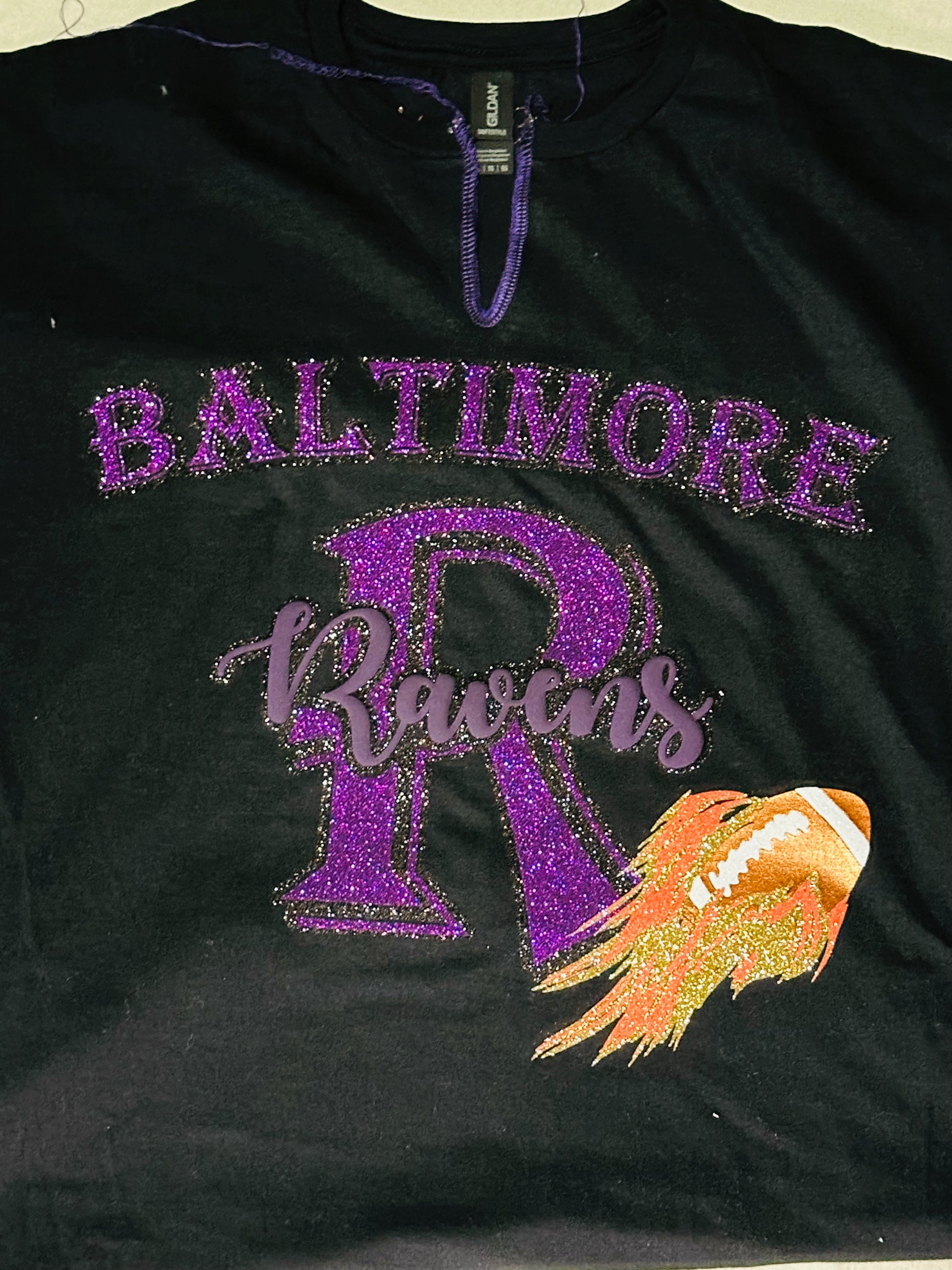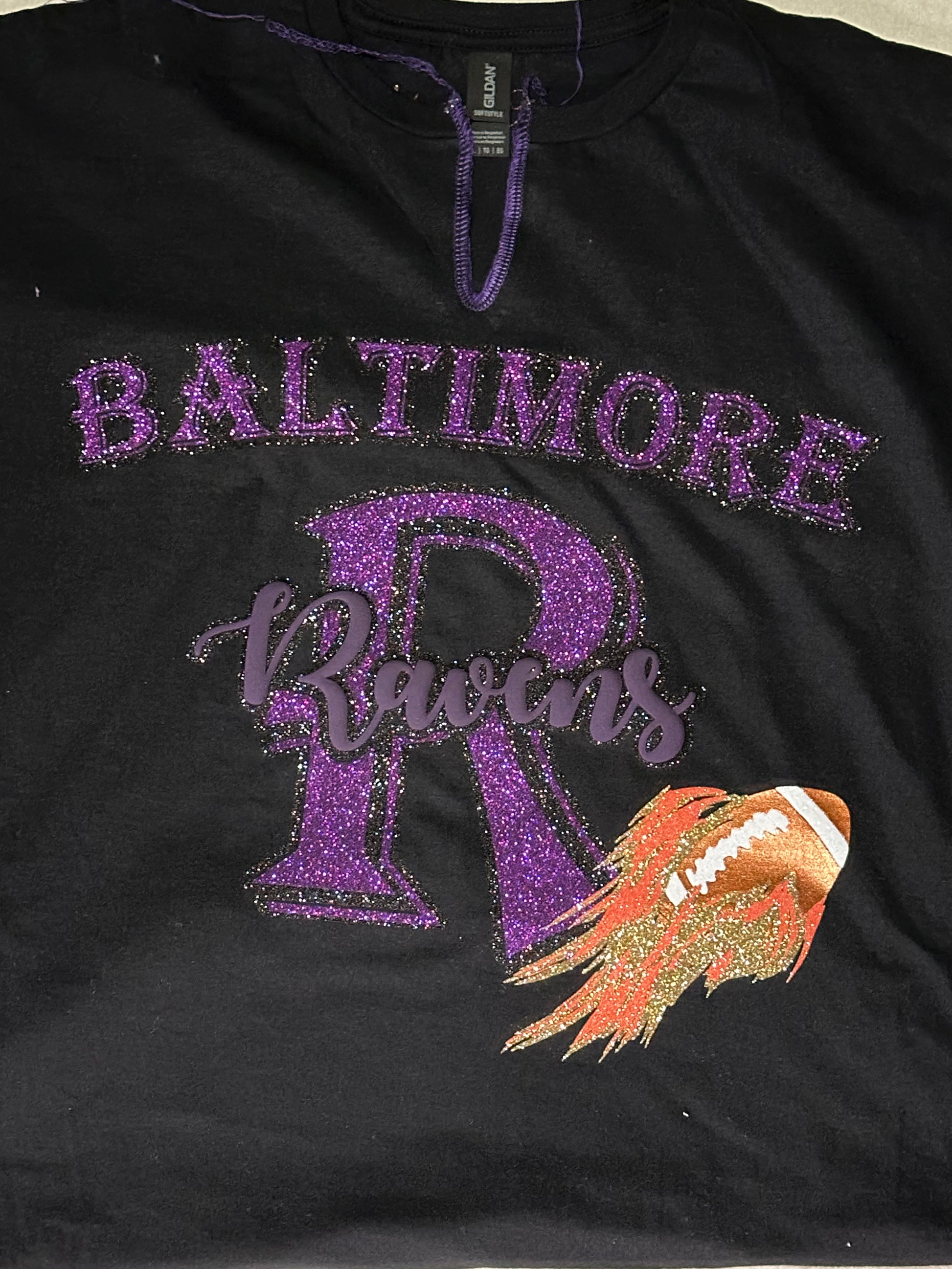 Show off your team pride with this eye-catching t-shirt from Mahogany Closet Boutique. The bold black and purple glitter lettering adds a touch of glamour, while the 3D puff lettering in the center and flaming football design make it a standout piece. Whether you're cheering on the Ravens at the stadium or watching from home, this shirt is the perfect way to show your team spirit. Made with high-quality materials, it's comfortable and durable for all-day wear. Don't miss out on adding this must-have piece to your Baltimore Ravens collection.