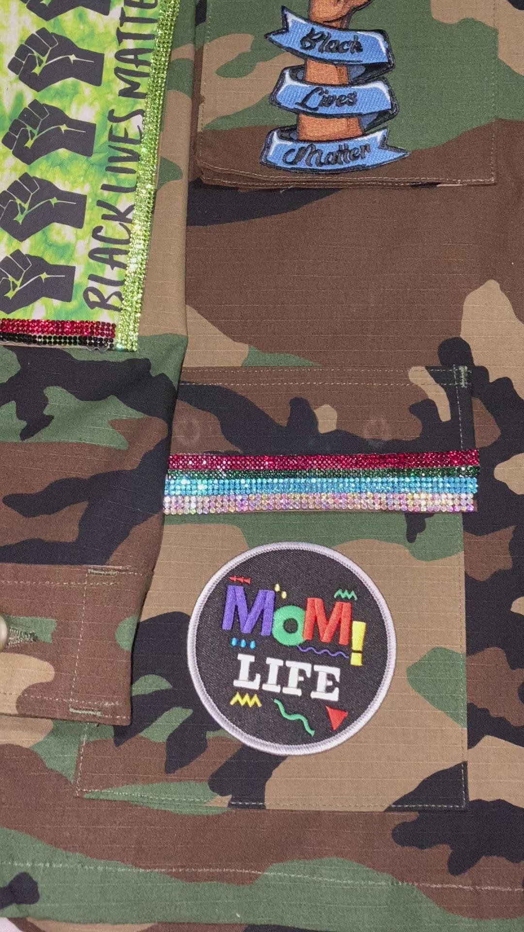 The Camouflage Jacket is a custom-made item specifically for the customer. It features one large patch/rhinestone design on the back and four patches/vinyl/rhinestone designs on the front. The jacket is made from cotton/ring-spun cotton, ensuring it does not stretch or fade when washed.