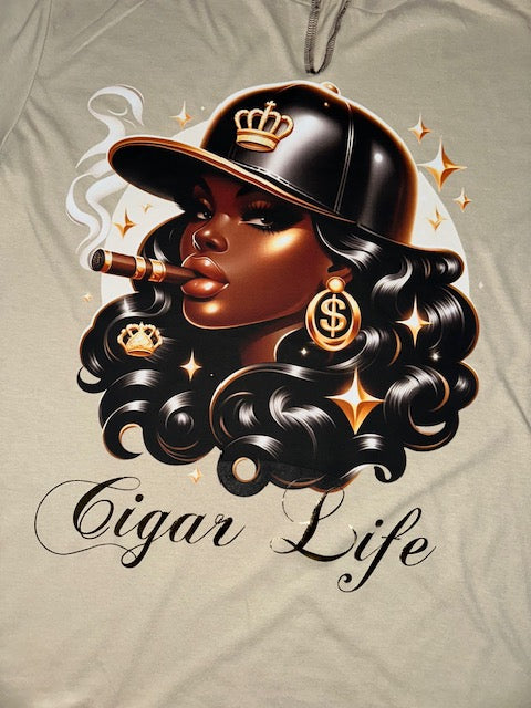 The striking vinyl design features a confident woman smoking a cigar while sporting a chic baseball cap. The phrase 'Cigar Life' is elegantly rendered in gold metal vinyl, adding a touch of luxury to your wardrobe.