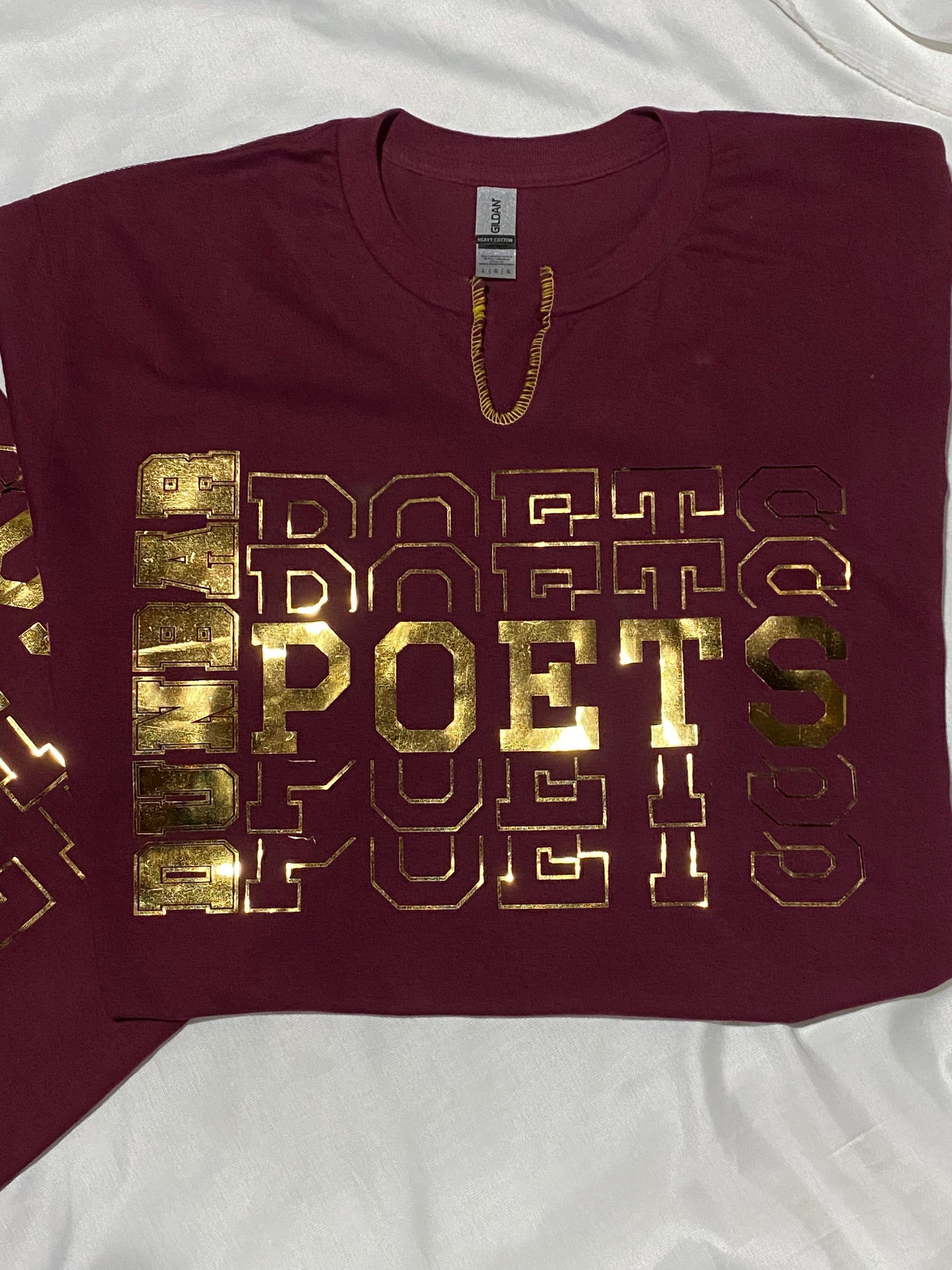 Show off your school pride with the Dunbar Poets Tee. This classic burgundy tee is adorned with bold gold vinyl lettering, paying homage to your favorite high school. Whether you're an alumni or a current student, this stylish tee is the perfect way to show your spirit. The female tees feature a unique slit at the collar, while the men's tees are a regular fit. And don't worry about sizing, as all tees are unisex. Ladies, if you prefer a snug fit, we recommend choosing a size smaller than your usual size. Get your Dunbar Poets Tee today and represent your school in style!