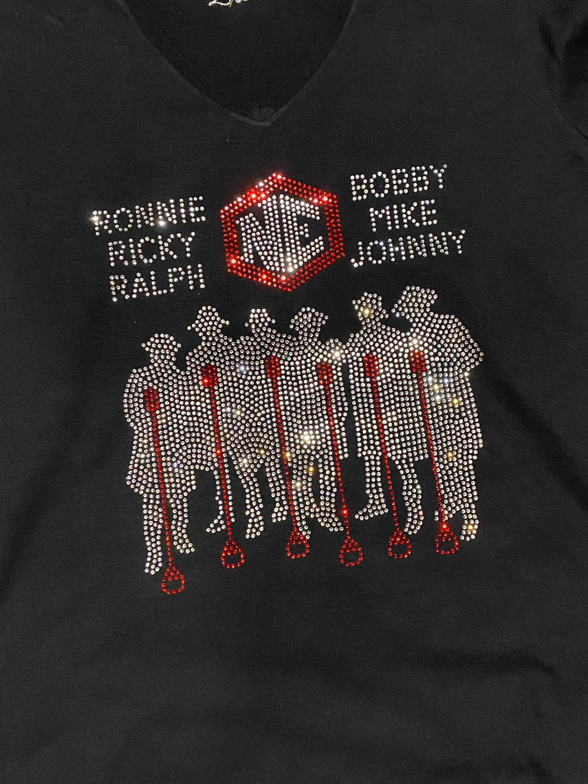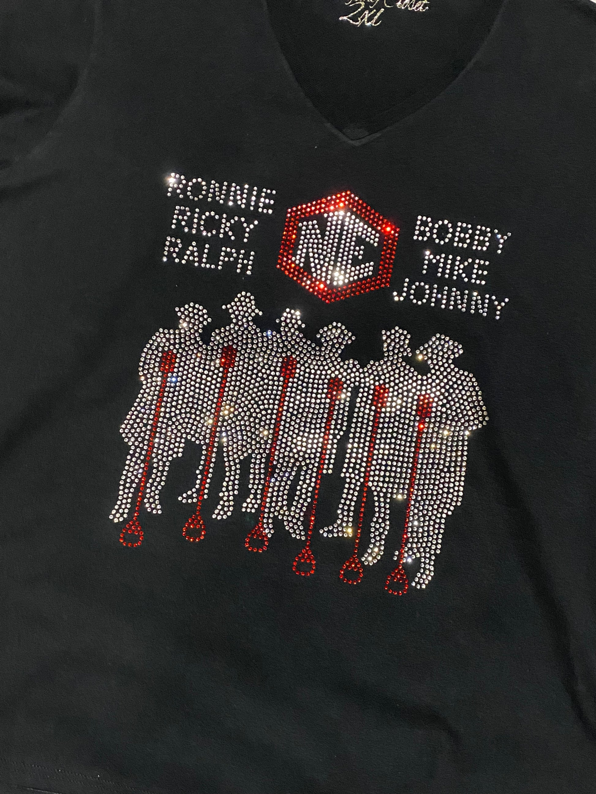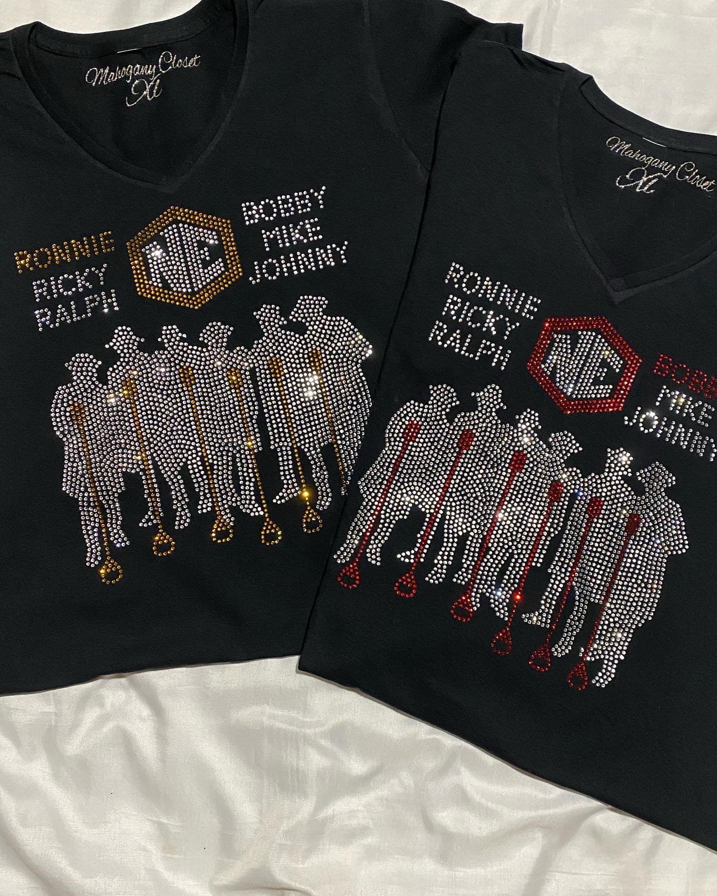 Celebrate the legendary New Edition with this stunning rhinestone-embellished tee. Featuring all six members rendered in shimmering rhinestones against a classic black cotton base, this piece delivers serious style and nostalgia. The slit collar is expertly trimmed and stitched to complement the intricate design, while bold red rhinestone accents add an extra pop of glamour. Perfect for devoted fans, this tee makes a bold fashion statement. Matching sweatshirt and hoodie options are available—the hoodie even features a coordinating bling string for maximum impact.