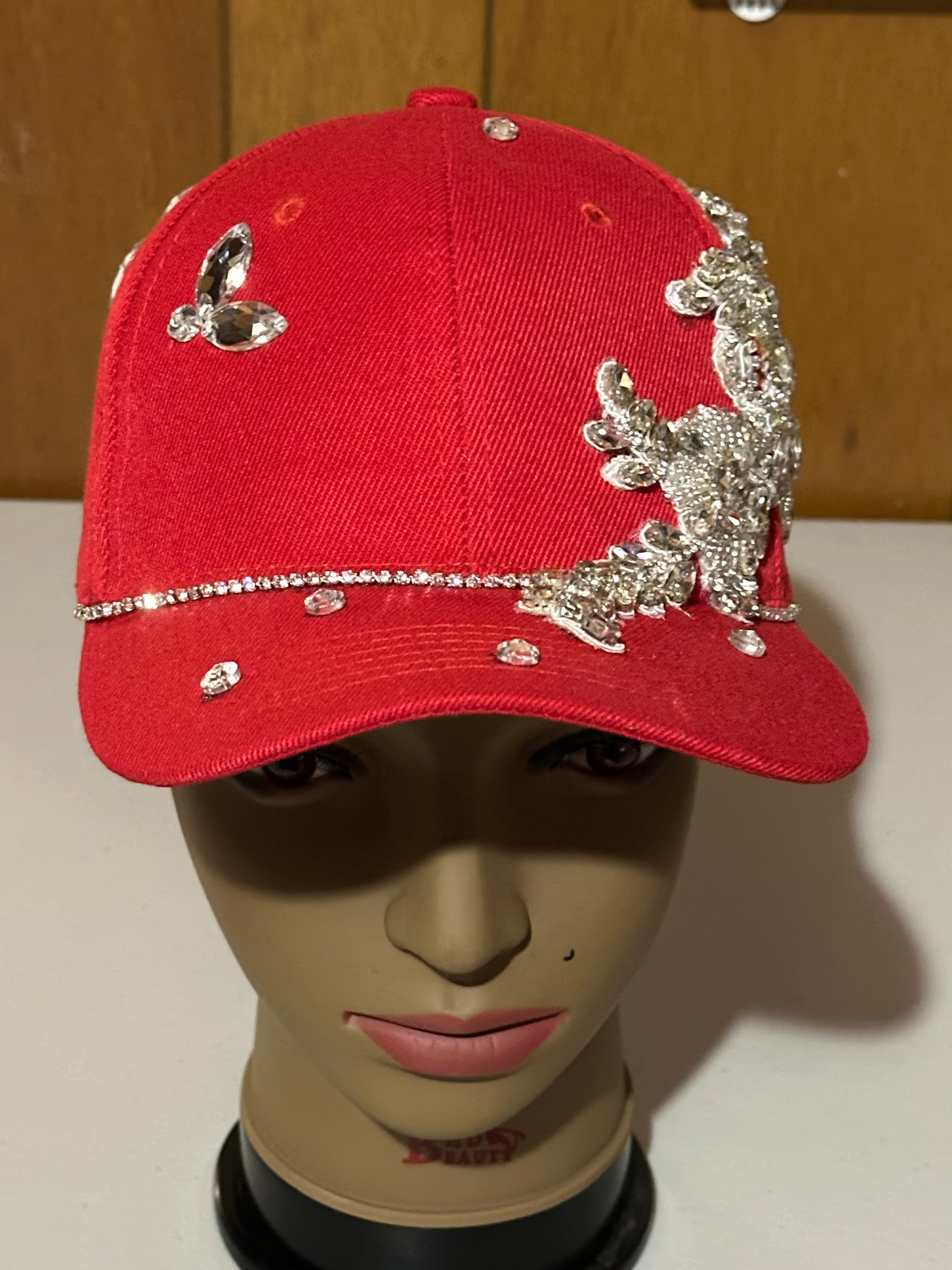 Make a statement with this stunning Red Brocade Hat, where timeless elegance meets eye-catching sparkle. Adorned with white rhinestones cascading across the crown and framing the brim with glittering trim, this hat transforms any outfit into something extraordinary. Perfect for special occasions, upscale events, or whenever you want to shine, the intricate rhinestone detailing catches the light beautifully and adds instant sophistication to your look. Whether you're dressing up for a celebration or elevating your everyday style, this red hat delivers the glamour and polish you deserve.