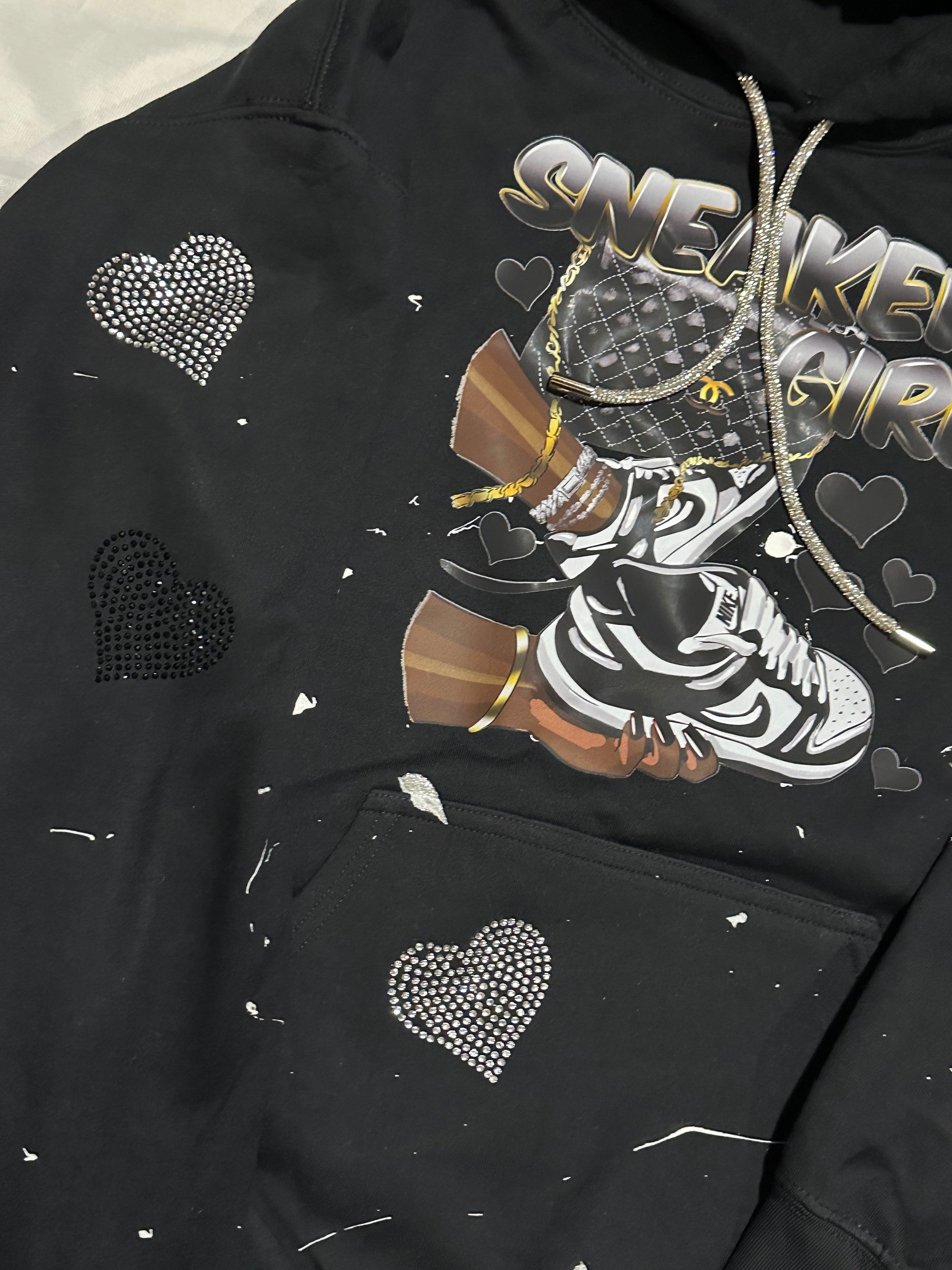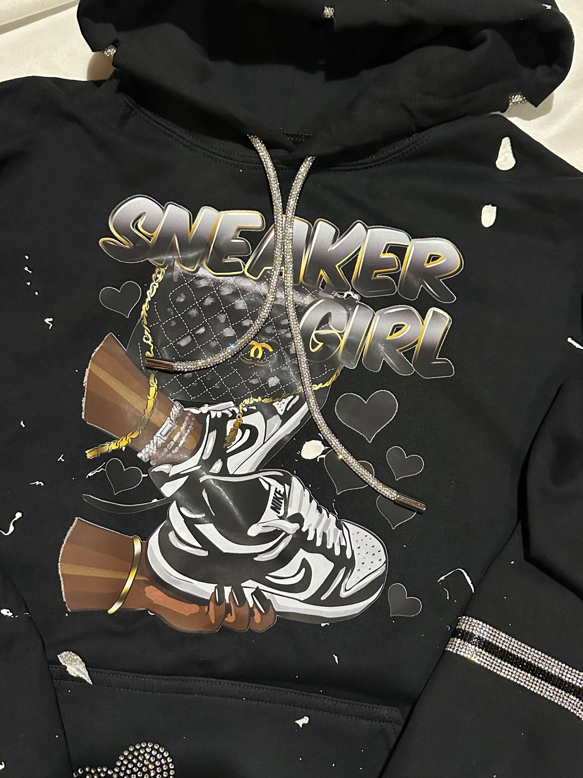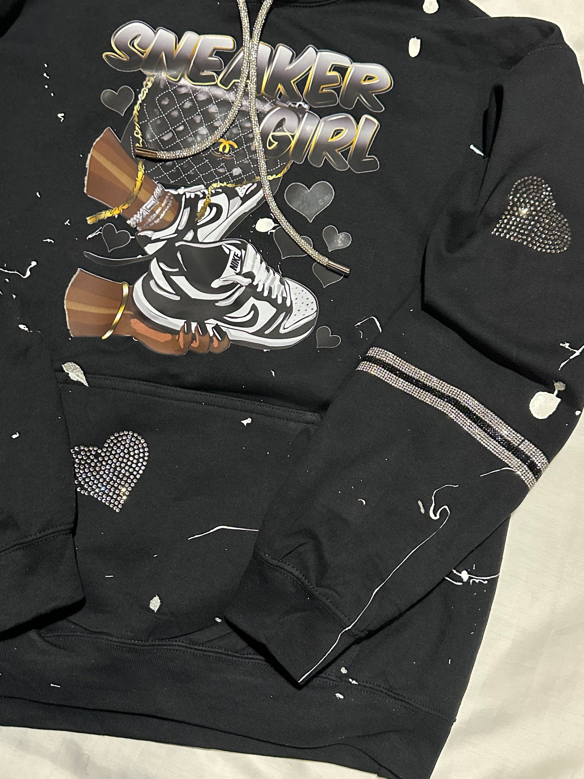 Elevate your style with the must-have Sneaker Girl Hoodie from Mahogany Closet Boutique. This black cotton hoodie features a trendy 'sneaker girl' graphic, adorned with unique white paint splatter and rhinestone heart designs. Complete your look with the added sparkle of rhinestone bands on the sleeves and a bling string. Perfect for any fashion-forward individual, this hoodie is a statement piece that will elevate any outfit. Don't miss out on this stylish and comfortable addition to your wardrobe.